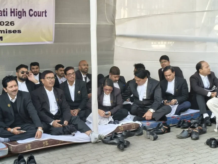 The protest began at 10 am in front of the historic Uzan Bazar high court building. GHCBA president KN Choudhury is leading the agitation, which lawyers say reflects growing concern among legal professionals and court users.